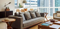灰色系布藝沙發搭配造型簡約的單椅與茶幾,灰藍色背景墻連接原木色吧臺,整體協調統一。