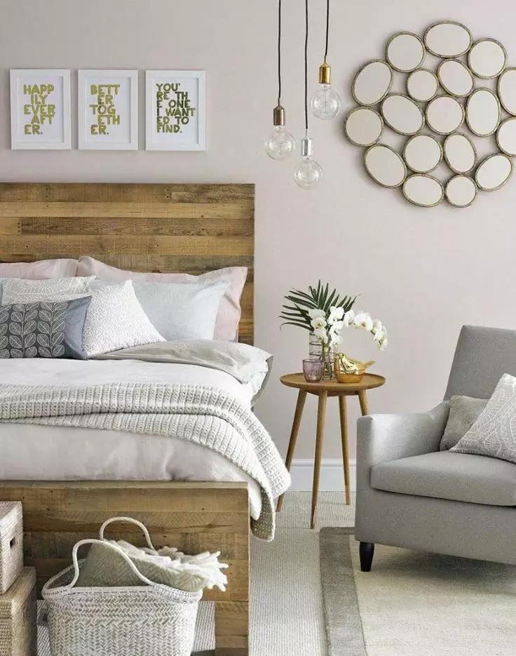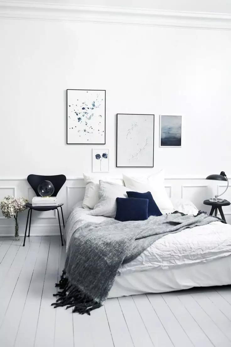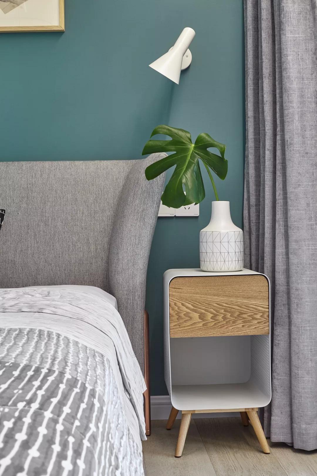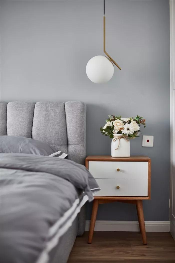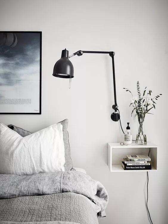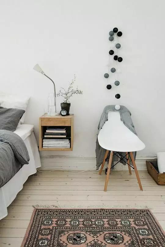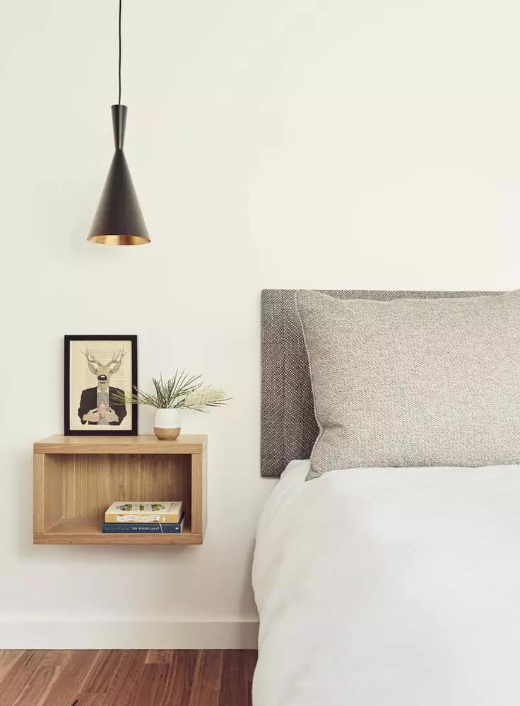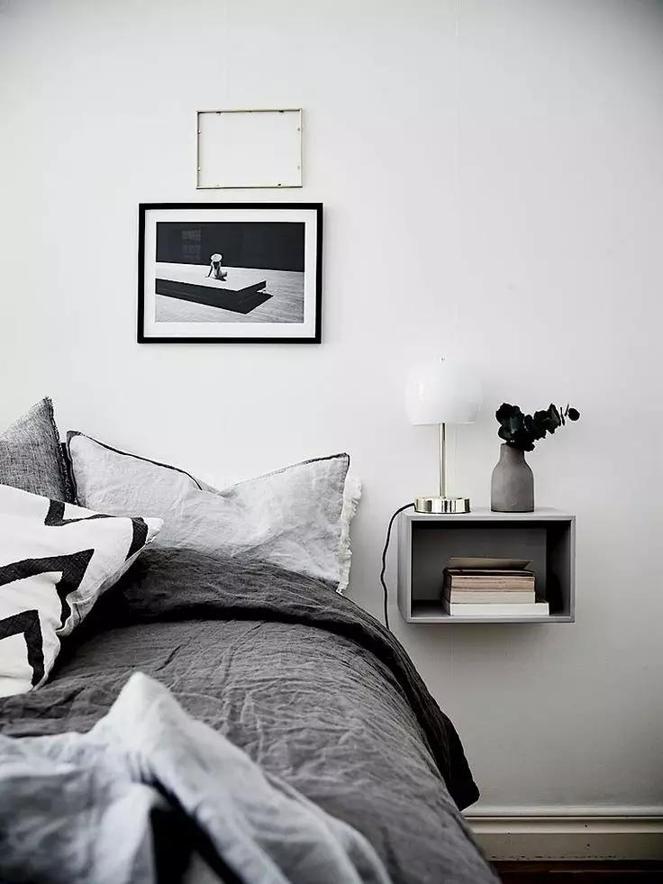 如果由于戶型的原因,放完床后,完全沒有床頭柜的位置,可以考慮讓這個(gè)收納設(shè)計(jì)上墻,因?yàn)椴恢挥械厣系拇差^柜才有收納功能,把床頭一邊或者兩邊的墻上設(shè)計(jì)一個(gè)能收納又能裝飾的置物架,或者置物框。比起普通的床頭柜,掛在墻上的小巧壁柜完全不占空間,剩余空間可以給其他家具。