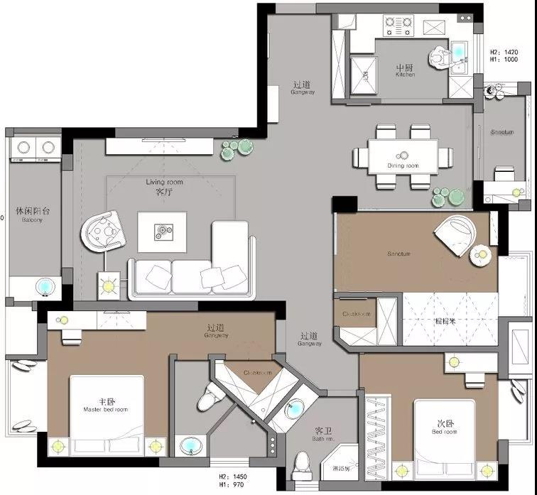 3、主臥不大,還是滿足了衣帽間的功能,雙外開門開向過道,利用過道的灰空間,主次衛(wèi)和衣帽間的重組,充分提高的利用率。