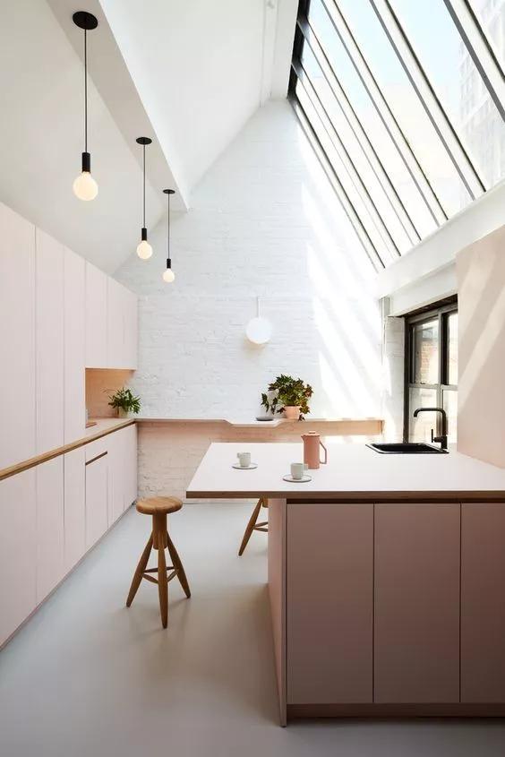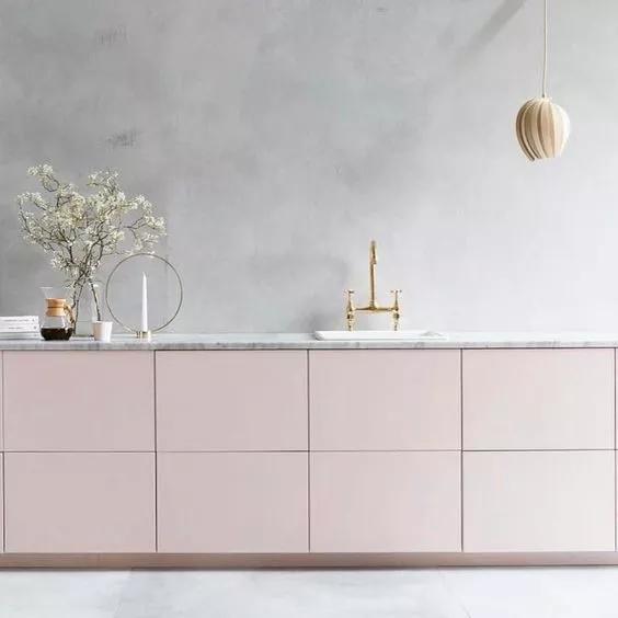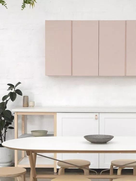 ▲ 淡粉色櫥柜,為中性廚房增添柔和色彩