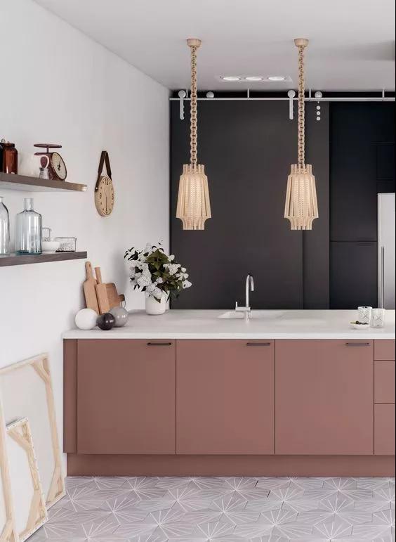 ▲ 臟粉色櫥柜,黑白色的墻壁和精致的吊燈營造出精致的外觀
