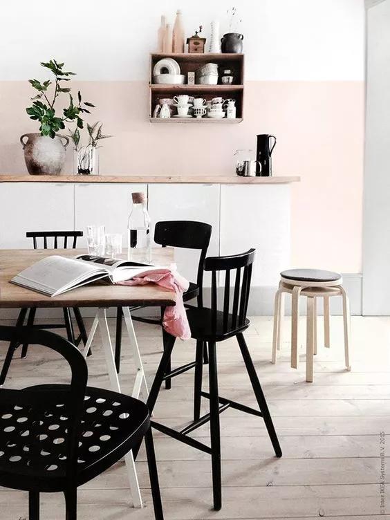 ▲ 玫瑰色的墻壁突出了用餐空間,柔化了黑色櫥柜和家具