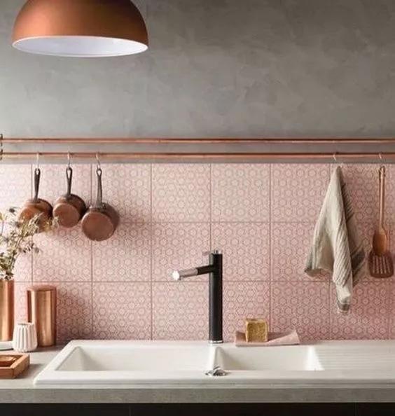 每個廚房都必須配備后擋板,這是一種可為空間增添粉色的時尚而簡單的方式。這樣你就不會在廚房里得到太多的顏色,但會添加一些細微的細節而不會太張揚。后擋板可以采用涂漆,鋪瓷磚,磚塊,壁板或任何其他形式,如果是瓷磚,可以考慮使用圖案,以增加裝飾的興趣。