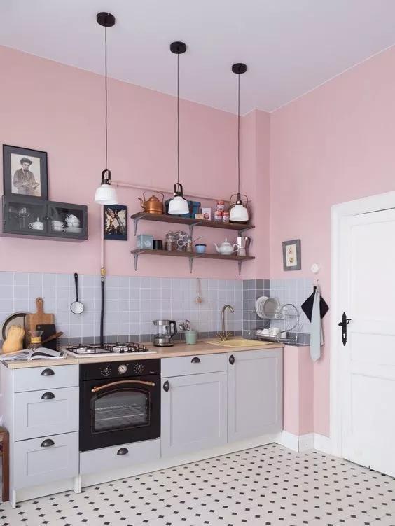 ▲ 粉色的墻壁和灰色是任何廚房的完美組合,黑色增加了深度