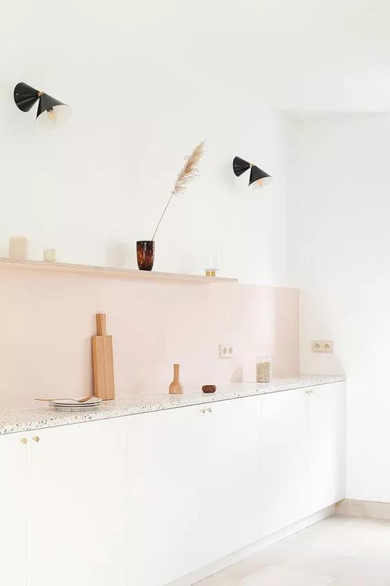 ▲ 淺粉色廚房后擋板為中性空間增添了微妙的色彩