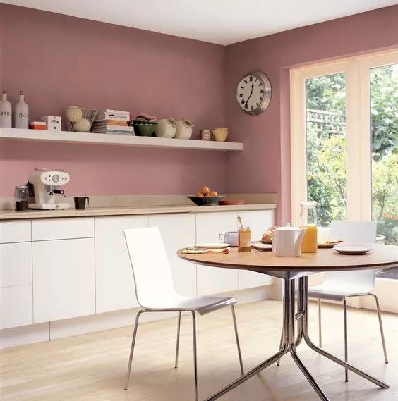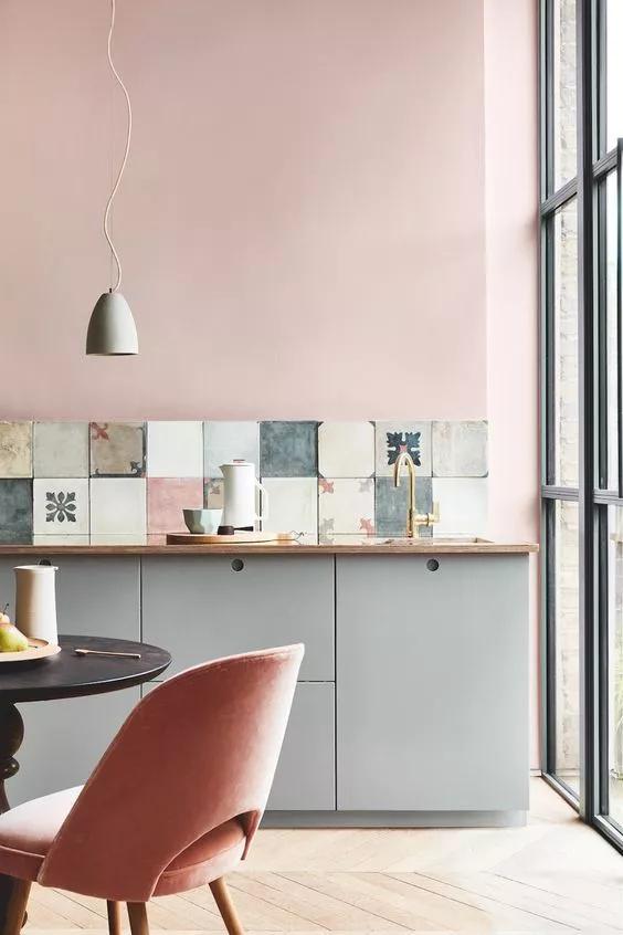▲ 粉色的墻壁和匹配的軟墊椅子搭配廚房的灰色