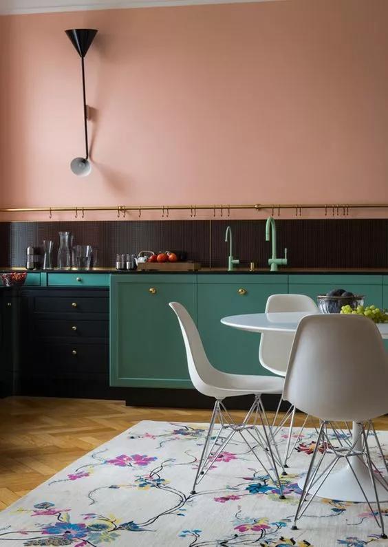 ▲ 深色調的郁郁蔥蔥的廚房采用醒目的粉色櫥柜和醒目的彩色餐桌