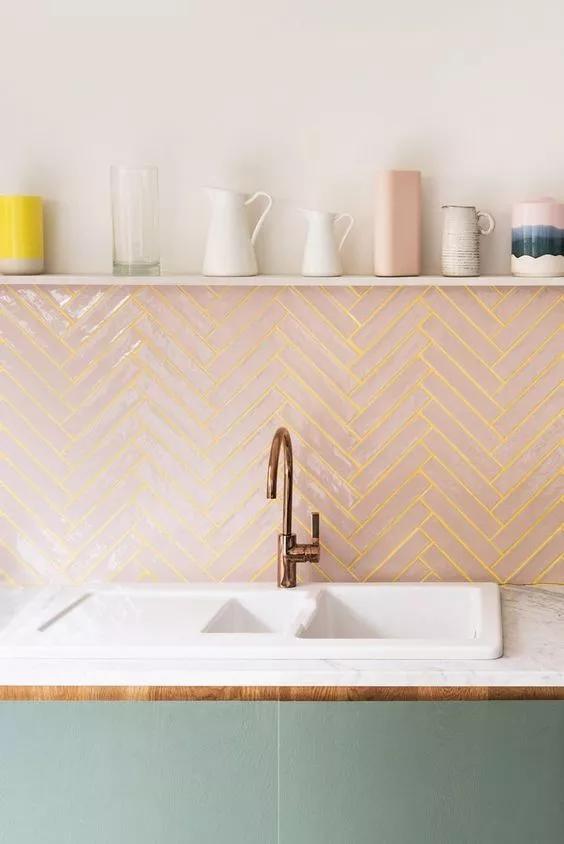 ▲ 粉色的魚骨拼瓷磚后擋板,霓虹黃色水泥漿,為廚房增添了大膽的氣息