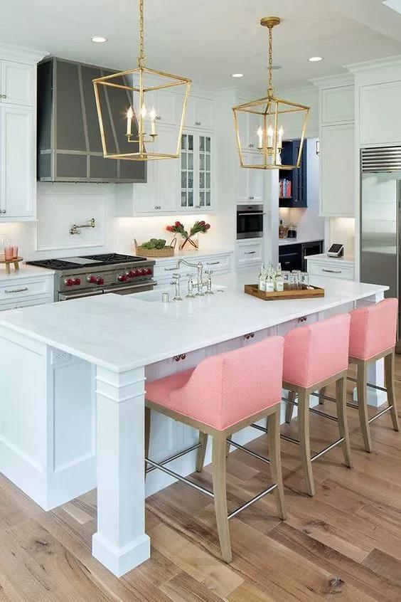 ▲ 粉色凳子為傳統廚房增添了白色的色彩,營造出現代風格