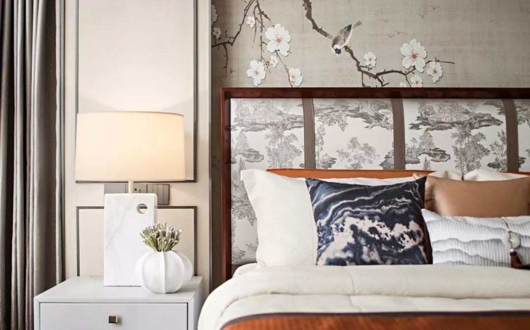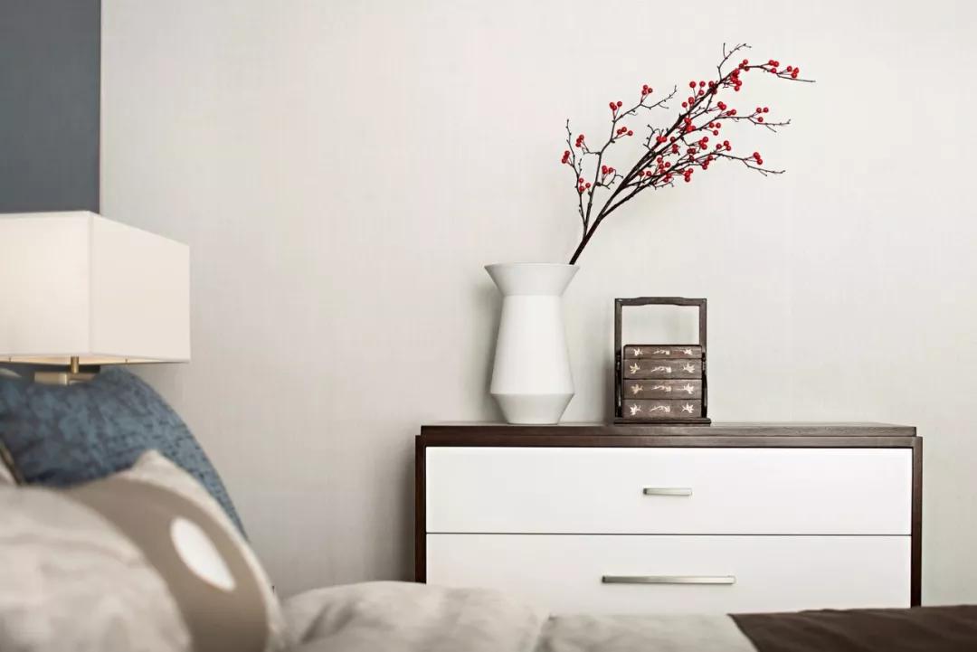 主臥的背景墻與客廳的屏風呼應,淡雅棉麻田園風。完全私屬空間,偶得幾處紅色,彰顯自由肆意的本心。枝頭鳥、海中浪、瓶中花,自然情趣悄然流露,人與自然和諧共生。