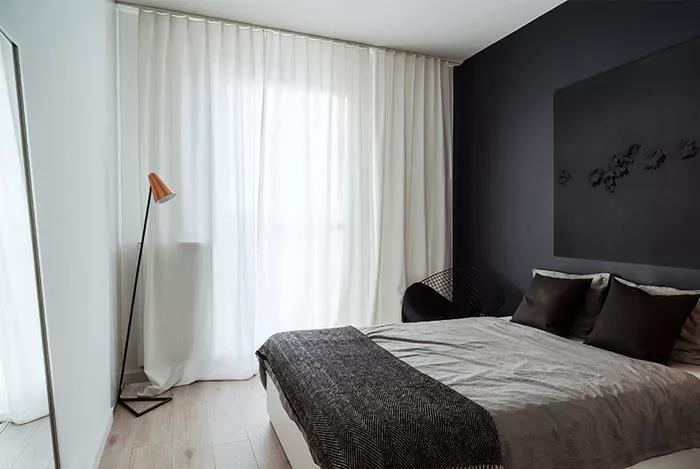 ▲ 黑色的床頭背景墻面,讓人沉靜下來(lái)
