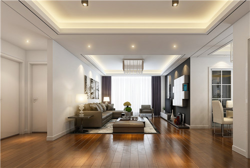 圖上這張新房裝修效果圖看起來比較高大上,空間也很寬敞,地面是深色的實木地板,沙發、窗簾、電視背景墻顏色也是偏深一些,和地面比較搭配。再來看看這天花板上,以黃色等待為主,四周是暖黃色的小射燈,給客廳帶來充足的光線。