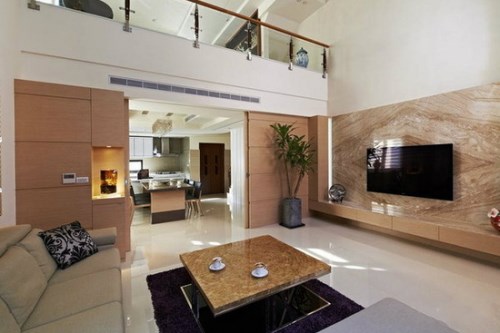 這個家的面積還是頗大的,有上下兩層。但是如果電視墻不加以裝飾的話,肯定會顯得更加的單調死了。然而,設計師通過局部設計,采用了光亮的大理石材來打造背景墻,既提升了居室的檔次,同時又達到了放大空間的視覺效果。