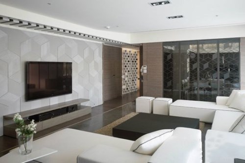 這是現代風格的客廳裝修,而電視背景墻采用了精密且細膩的手法,先將石材進行切割,然后拼貼一起,盡顯大方又簡約時尚的視覺效果。其實,這些石材經由斜角的裁切,就已經產生出不對稱的魅力了,這樣的設計不喜歡它都難。