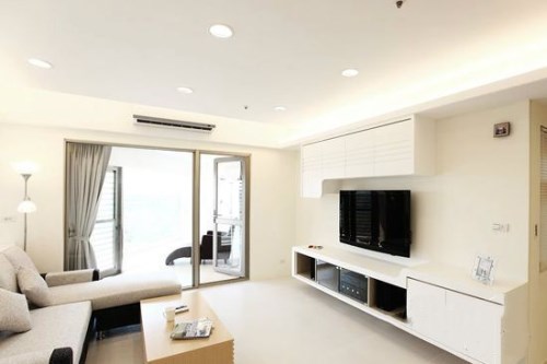 整個客廳看上去就非常的簡潔和干凈,而淺鵝黃色的墻壁在射燈的映襯下,營造出溫馨的氛圍。為了化解單調無味之感,設計師將具有俐落線條的白色柜子鑲嵌在了電視背景墻上,既起到裝飾的作用,又很好的增加了居室的收納性能,真是一舉兩得。