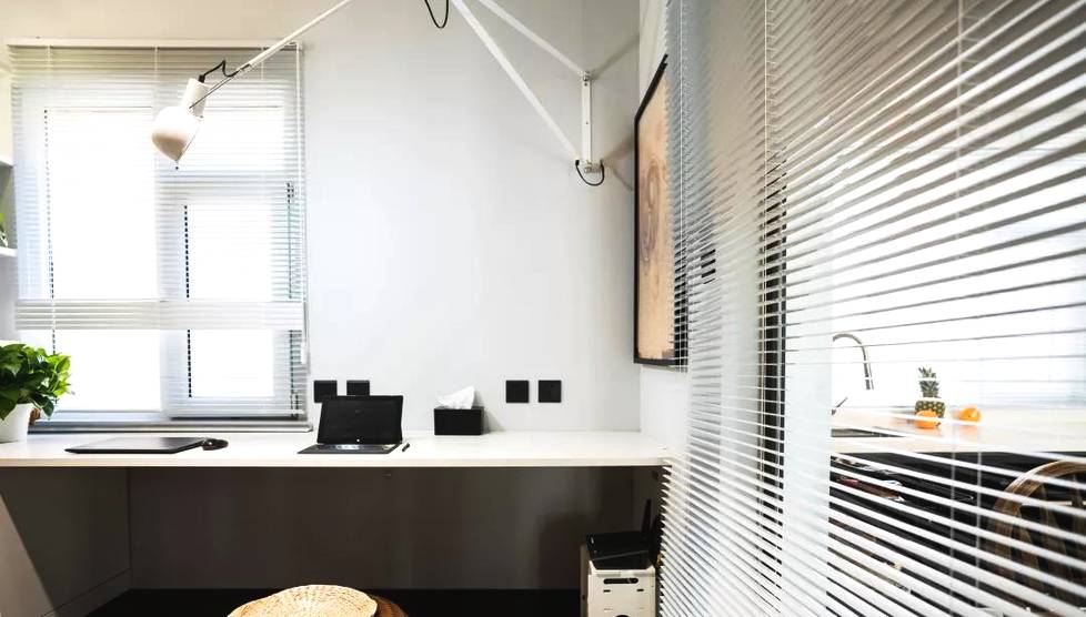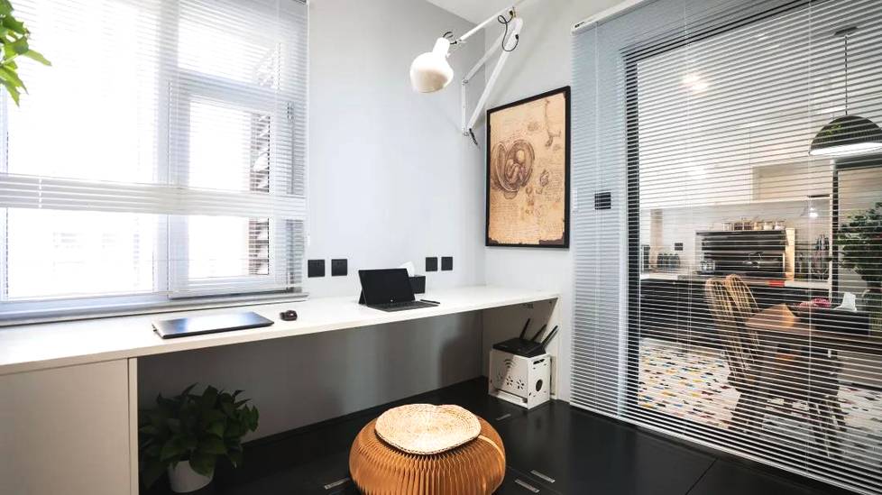 原本封閉狹小的書(shū)房空間,跟餐廳間的隔墻換成了玻璃隔斷,在視覺(jué)上擴(kuò)大了空間感。