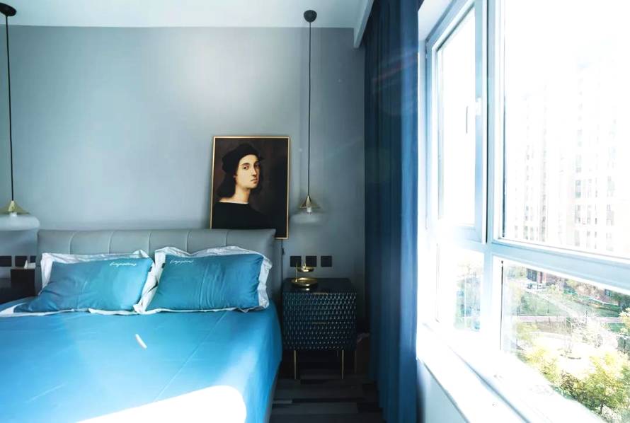 臥室整體采用寶石藍(lán)和淺灰色,安靜舒適。