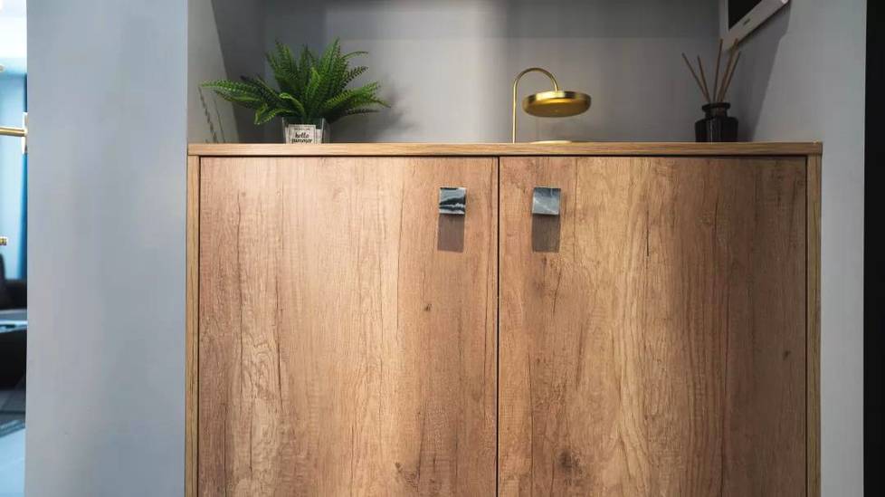 玄關(guān)處是常見(jiàn)的木質(zhì)鞋柜,日常可以用來(lái)儲(chǔ)放鞋、鑰匙、包包,簡(jiǎn)單實(shí)用。有個(gè)小細(xì)節(jié)讓人驚喜,柜門(mén)的拉手采用天然石材,細(xì)看還有點(diǎn)萌。