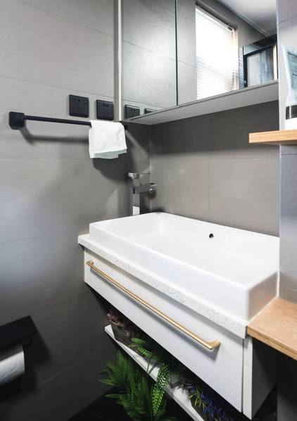 衛(wèi)生間的風(fēng)格截然不同,黑色元素的加入讓空間的私密感更強(qiáng)。