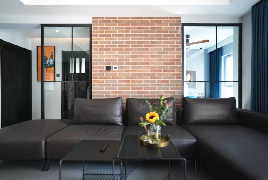 拆除牛皮沙發(fā)后面兩側(cè)的隔墻,替換成黑色邊框的玻璃隔斷,讓客廳能夠直接“借”到臥室的陽(yáng)光!另一個(gè)點(diǎn)睛之筆就是沙發(fā)后的紅磚墻,采用紅色文化石錯(cuò)拼鋪貼,淺灰色填縫,為客廳增添了生活氣息。