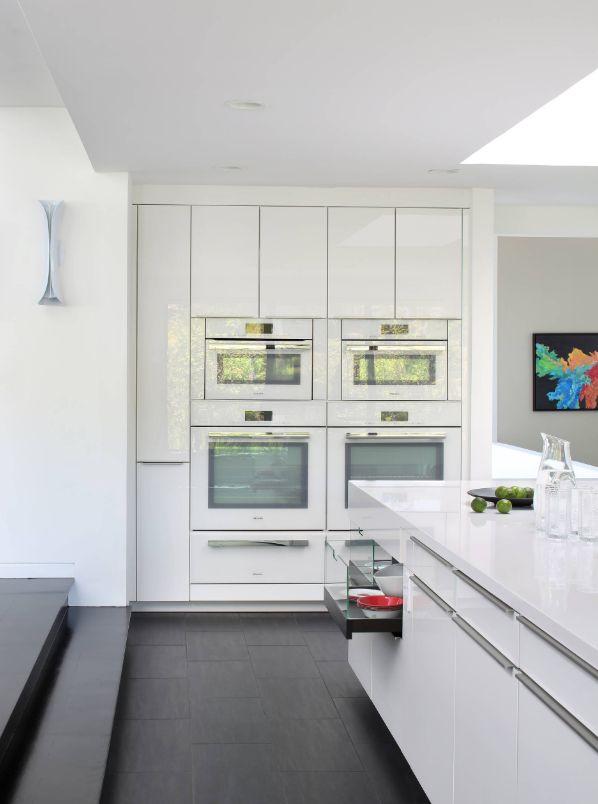 盡管看起來有些奇怪,但黑色家電在白色廚房中看起來很漂亮。對比強烈而有意,最終將改變房間的氛圍。該組合在由Robson Rak Architects與Cohen制造的房屋共同設計的住宅中非常有意義。