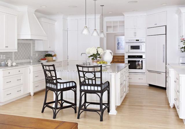 即使所有的櫥柜,島臺,工作臺面,電器乃至燈具都是白色的,也仍然不能使廚房顯得平淡無聊。如果有的話,它給人一種非常時尚而優雅的魅力,Lakeside Development工作室通過采用不同的飾面和圖案并在設計中引入木地板來確保這一點。