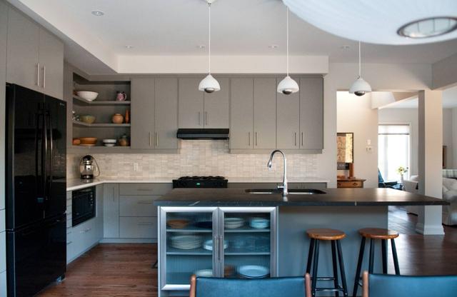 黑色的電器使這間廚房看起來時尚。它們與灰色櫥柜,木地板和白色后擋板配對。Studio Cabinet Works Plus使這間廚房看起來很簡單,并利用黑色電器為空間增添了深度和個性。