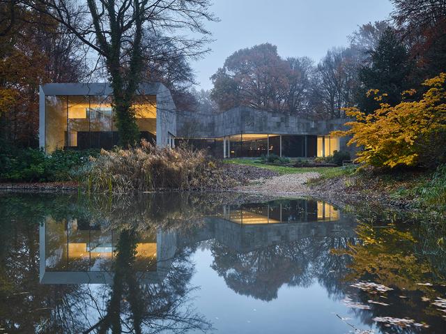 這個在寧靜的大自然懷抱中的房屋,是建筑師團隊DDM Architectuur的項目。該房屋的設計過程包括在不斷變化的季節中圍繞日照小時進行仔細的研究,以及如何最大程度地提高日照。對周圍景觀的觀感也是至關重要的,就像將這個家與它的位置環境交相輝映一樣。解決方案是一種建筑布局,其形狀可以圍繞綠色景觀的特征彎曲,設置在池塘和小湖之間,并歡迎每滴可用的陽光。房屋完全用天然石板覆蓋,包括屋頂和外墻,將其與周圍環境完全融合。