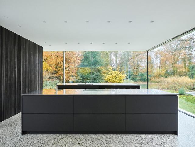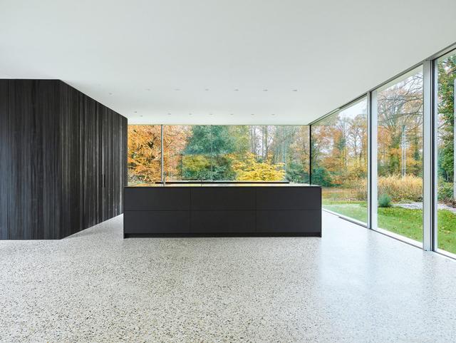 簡約風格的廚房在開放式客廳的后面幾乎沒有引起注意。基本的黑色體積在淺色地板上延伸,根本沒有可見的上層櫥柜。