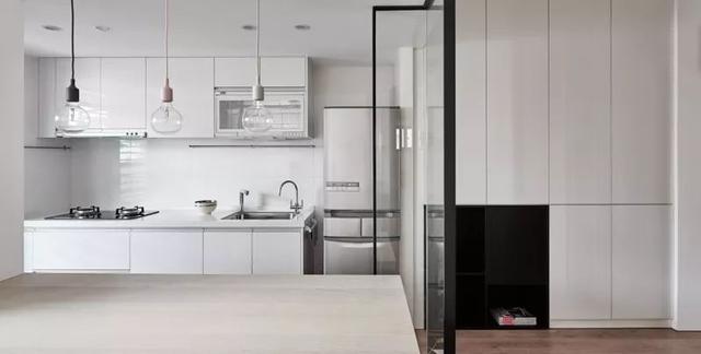 廚房整體的白色色調,留出的空間是一字型廚房,但是空間也足夠屋主去做飯了。