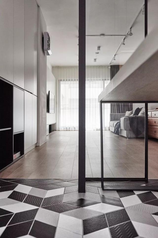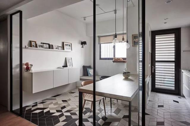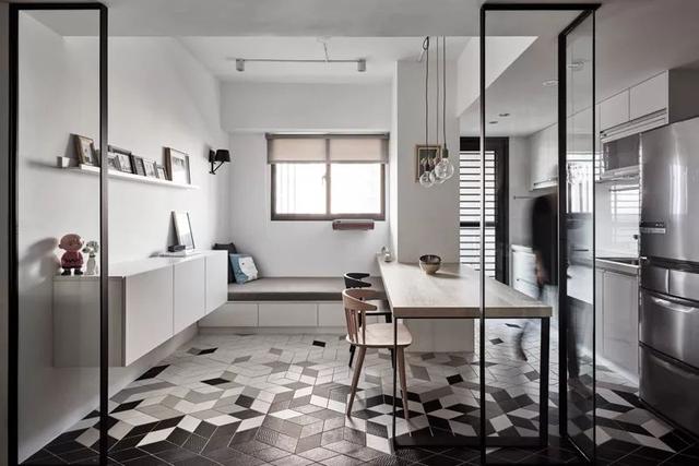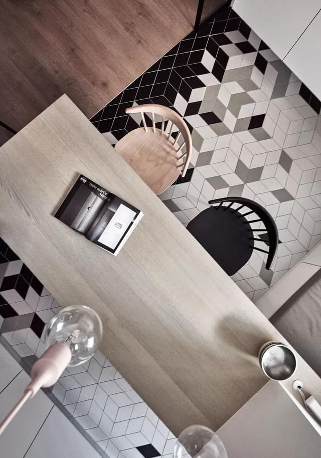 地面用于區分也選擇了適用于廚房的防滑防水瓷磚,黑白灰三色的漸變感很好看