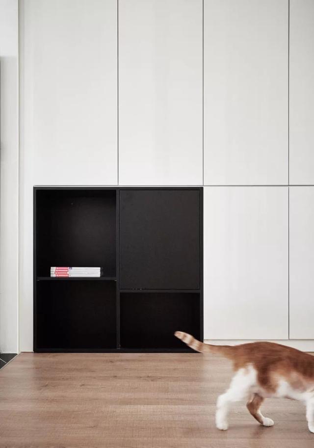黑白收納柜子,底下是開放式的,有時候貓咪會臥過去。
