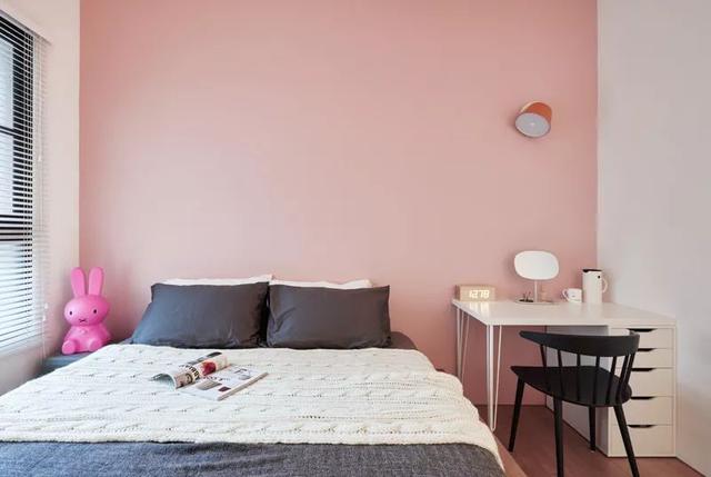 充滿少女心的睡眠空間,用煙灰粉做背景色,全屋無主燈設計,只做了壁燈,還有黑白配的梳妝臺。