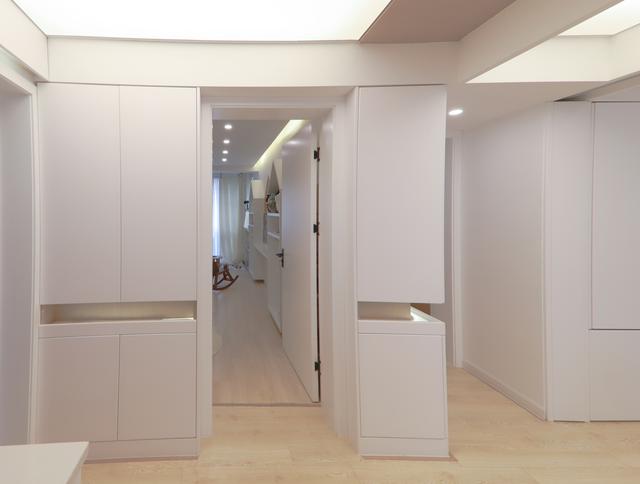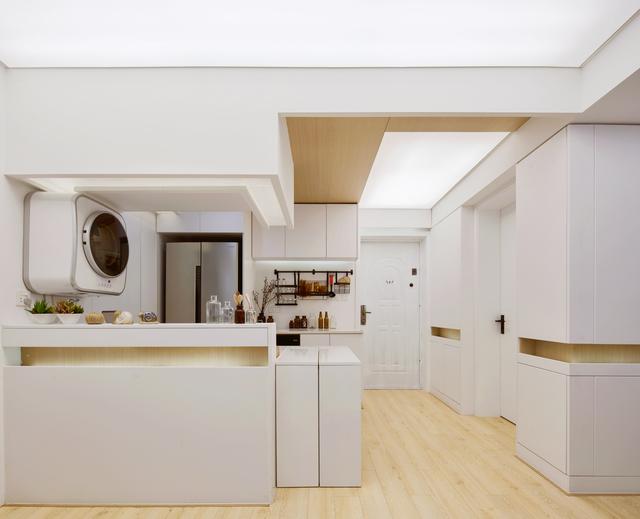 房間采用白色與原木色搭配,營造出安靜溫馨的氛圍,視覺上把空間放大。發光燈膜和木飾面吊頂的運用讓玄關變得明亮且寬敞。