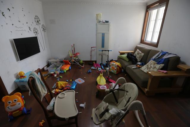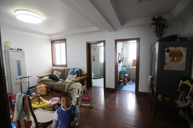 60㎡的二居室要住三個10歲以下的孩子,兩個成人,還有一個75歲的老人。在原有房間結構不變的基礎上,為了給兒童房一個安靜舒適的休息、學習環境,設計師打掉陽臺與房間隔斷,讓原本擁擠、光線不足的兒童房變大變亮。主臥改造成榻榻米房間,增大儲物體量又分隔出書房區。將客廳打造成集合會客、兒童活動以及外婆的臥室多重功能。在廚房與客廳中間,增加了一個帶烤箱和水槽以及洗衣機的西廚。媽媽既能完成備餐和洗衣,又能同時看護客廳玩耍的寶寶。衛生間使用了雙盆和雙衛的設計,兩個馬桶之間用磨砂玻璃隔開,形成兩個獨立的空間。可以緩解早晨一家人如廁緊張的問題。