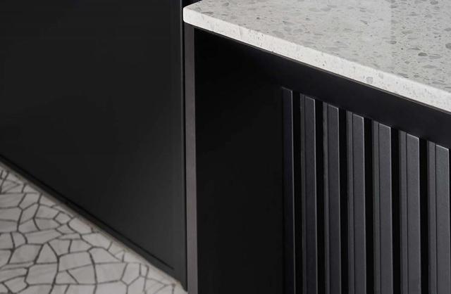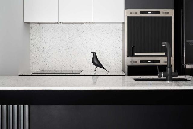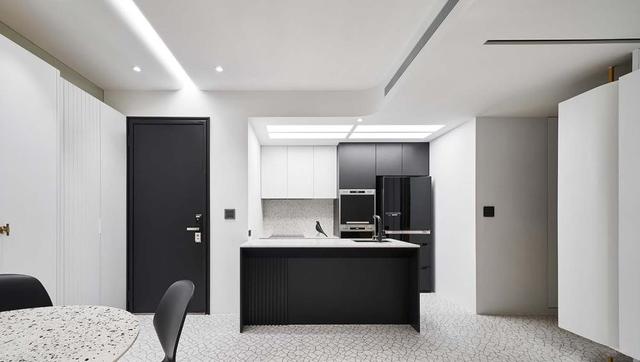 中島下方及冰箱周圍以黑色作為柜體顏色,部分線條裝飾減輕柜體厚重感,中島臺面及壁面同樣使用白色水磨石維持空間調性,色彩對比讓此區的視覺深度更深,也讓公共空間因此更有層次。