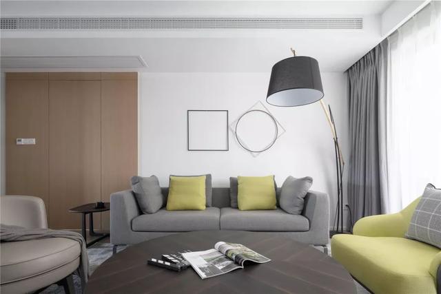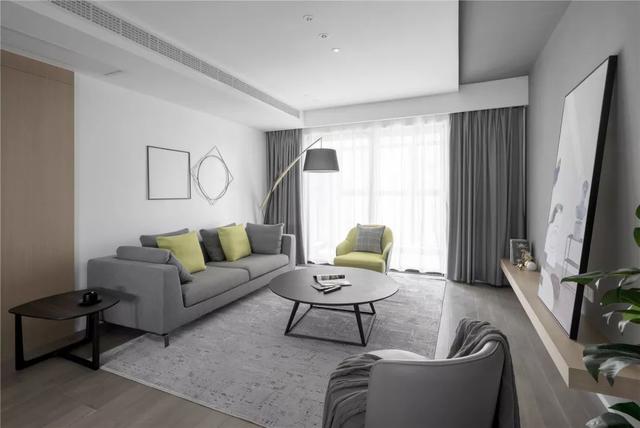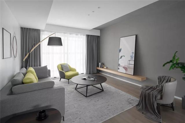 ▲客廳整體簡約自然的空間,搭配灰色地毯、窗簾與沙發,還有一張深色的茶幾,呈現出一種舒適輕松的愜意感。