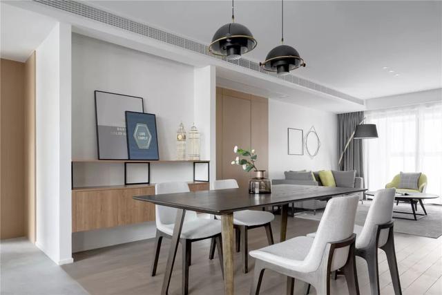 ▲餐廳與客廳隔著過道,靠近過道還裝了一個定制柜,柜體留空作為掃地機器人的擺放位置,巧妙的構思保持空間的簡潔與實用性。