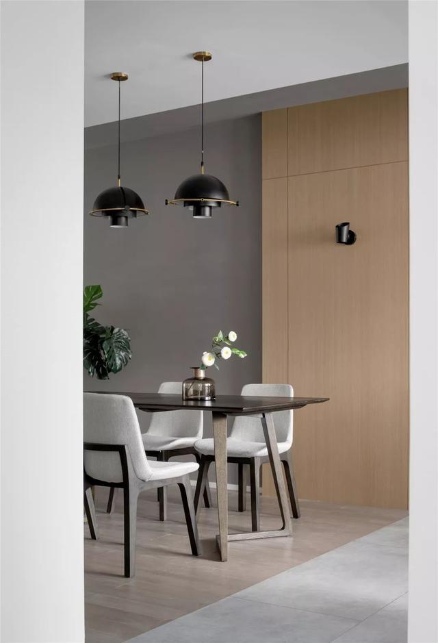 ▲餐廳地面貼的是木紋磚,木飾面+隱形門貫穿了沙發墻延伸到餐廳區域,讓簡潔灰色調的餐廳空間,也顯得暖馨愜意。
