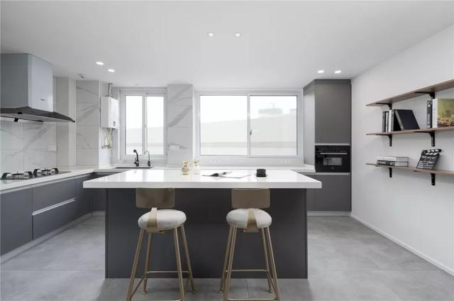 ▲啞光灰色的地面磚基礎,廚房整體灰白配的空間,中間做了一個中島臺,讓烹飪空間有著更加輕松有趣的體驗。