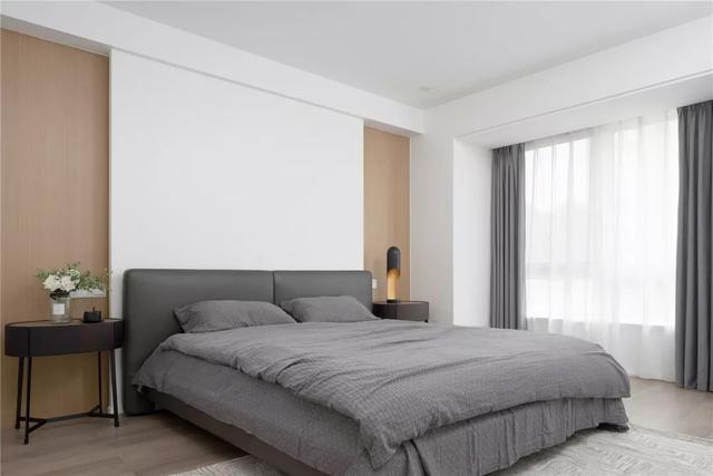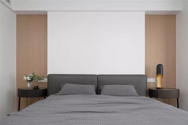 ▲臥室床頭墻中間潔白+兩側木飾面的設計,搭配一張灰色的皮藝床,兩側黑色的床頭柜,簡潔的空間也顯得舒適端莊好大氣。