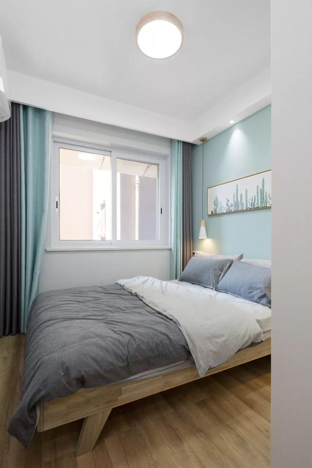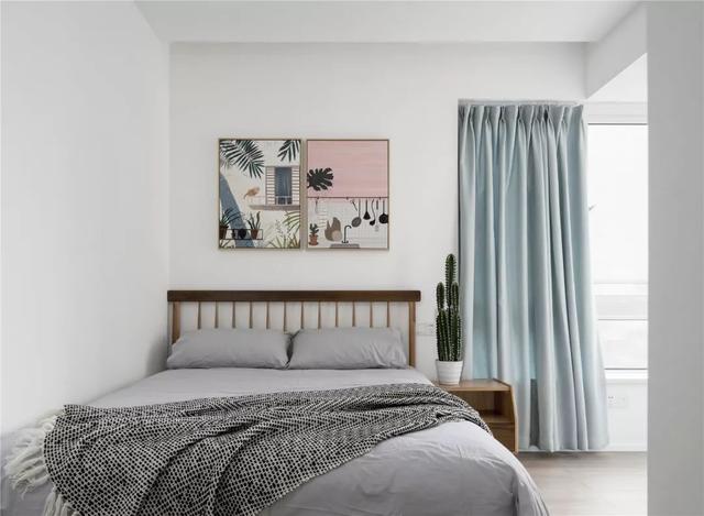 ▲次臥靠墻擺上一張實木床,側邊靠窗一個床頭柜,床頭墻掛兩幅ins風的掛畫,搭配淺藍色的窗簾,給人以輕松自然的清新感。