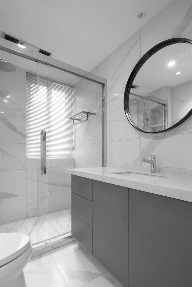▲灰白配的衛生間,雅白的墻面地面磚,搭配灰色的洗手盆柜,墻面一面圓形的裝飾鏡,帶來一個干凈簡雅的衛浴空間。