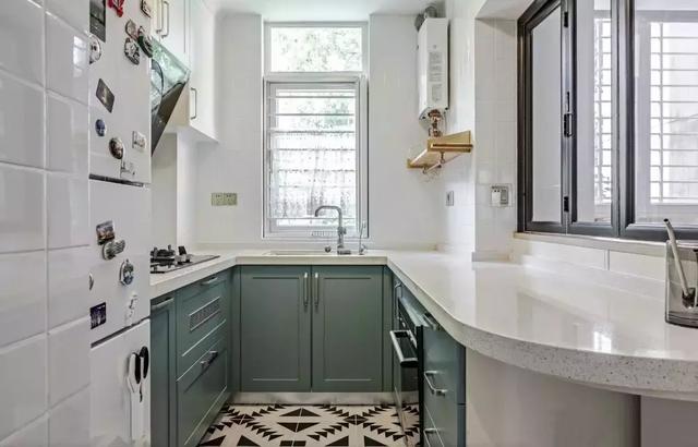 ▲半開放式的廚房,以灰色地面磚的空間,搭配木質定制櫥柜,還有青色的墻面磚,讓做飯的空間也更加年輕自然。