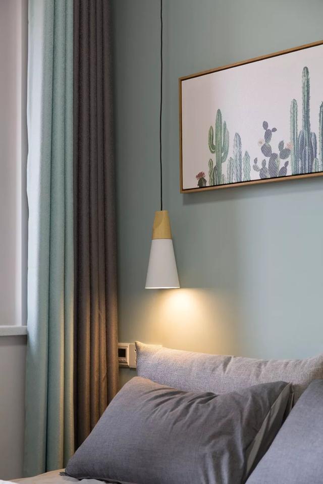 ▲床頭墻掛上一幅植物范的掛畫,搭配上清新簡潔的空間,顯得充滿文藝舒適的氛圍感。