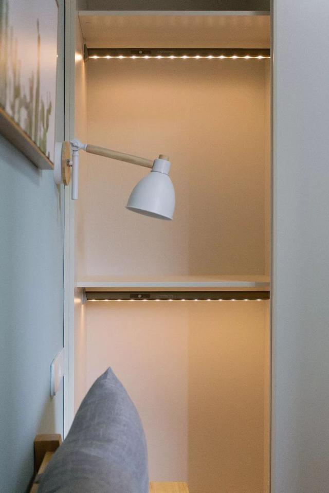 ▲床頭側邊的衣柜里側留空出一列的空格架,提供了實用豐富的展示與儲物空間。
