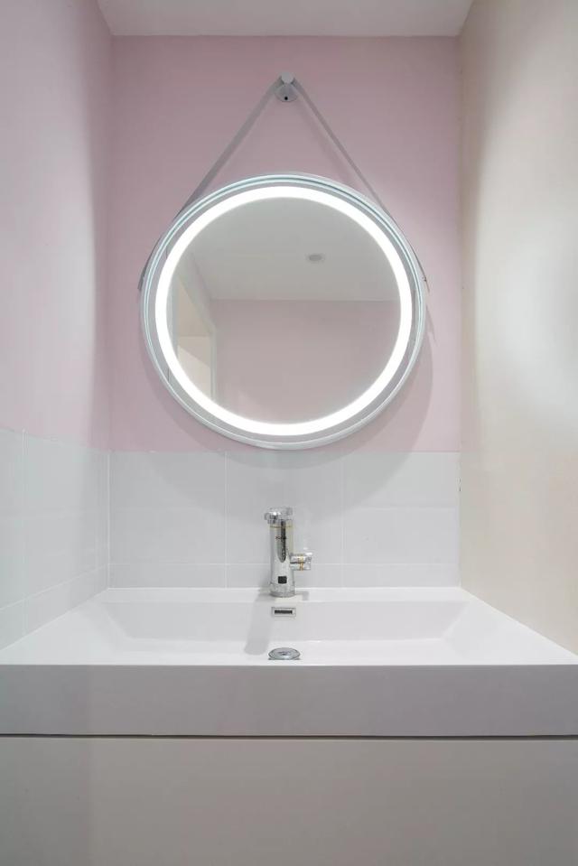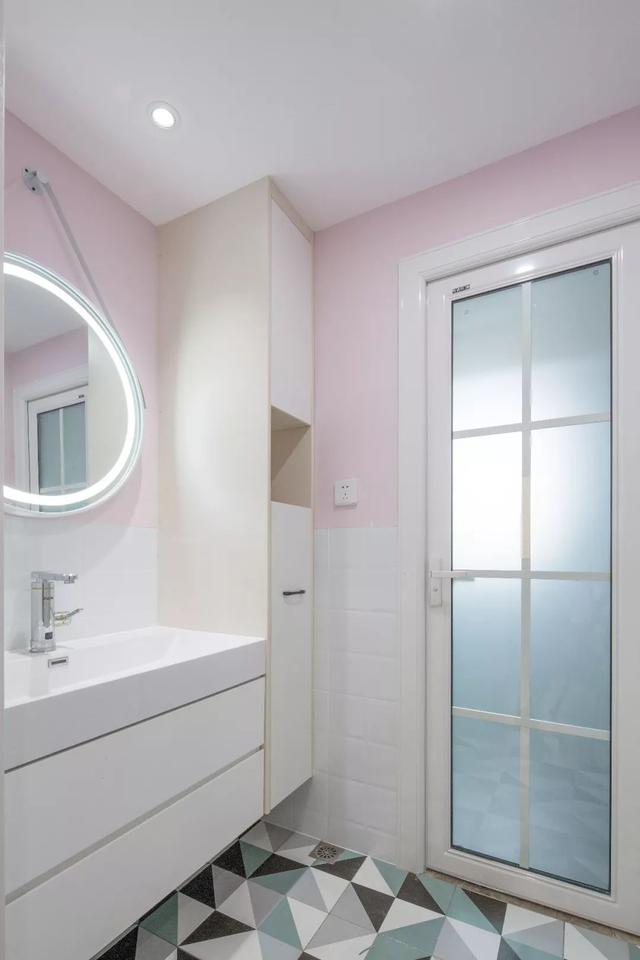 ▲衛生間把洗手盆設置在過道區域,在三角幾何地磚的基礎,白色墻腳+粉色墻體,布置出一種溫情浪漫的大氣感。