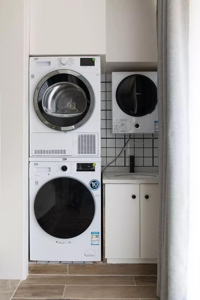 ▲陽臺的洗衣機+烘干機疊放,旁邊的洗手盆柜上還壁掛了一個兒童洗衣機,讓洗衣晾衣都有著輕松實用的使用感。