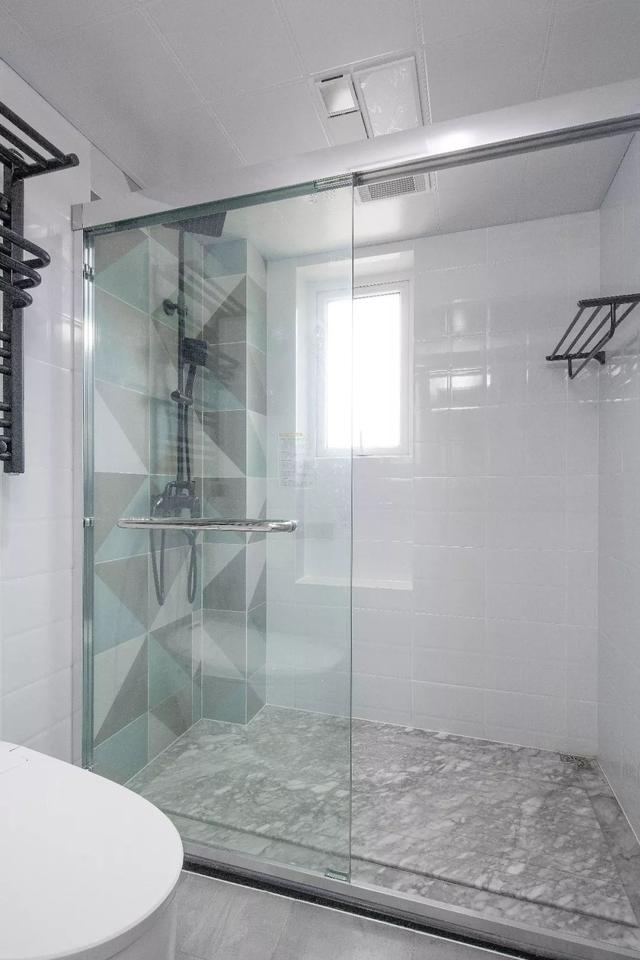 ▲衛生間以獨特紋理的灰色大理石,淋浴花灑的安裝墻面,也是以黑白青色的三角圖案磚鋪貼,帶來干凈優雅的衛浴體驗。