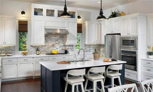 櫥柜的選擇,我們不能按照標準尺寸來做,我們要簡化櫥柜的設計,因地制宜的設計,以留出空間兼備其他功能。島臺就是一個不錯的設計,它可以兼顧備餐、就餐,還可以擴展空間,直接豐富了整個廚房活動路線,加寬了回轉區域。